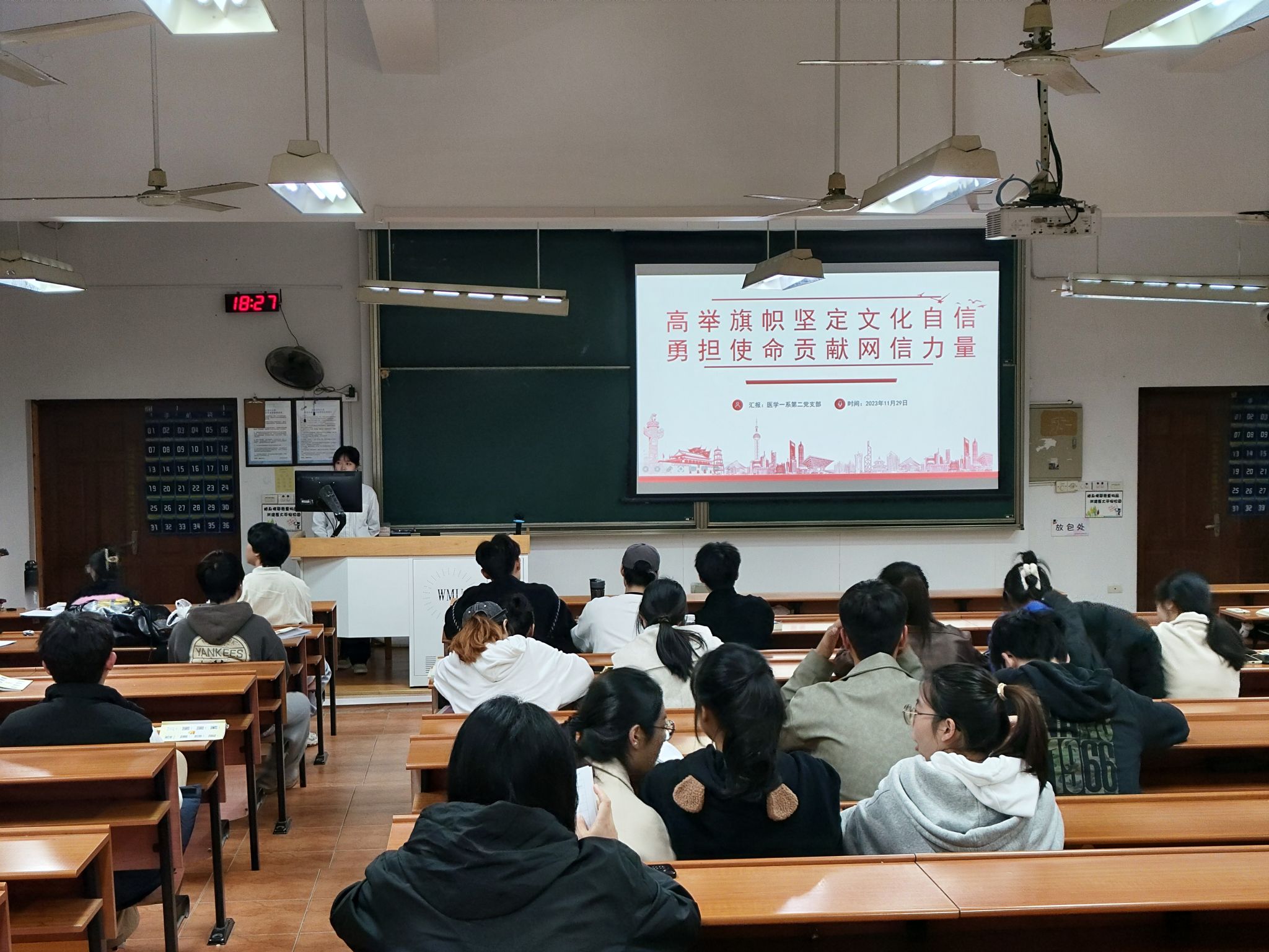 2023年11月29日,党建服务与人才培训中心在茶山校区开展了主题为“高举旗帜坚定文化自信,勇担使命贡献网信力量”的一周看时事活动。主讲人从四个方面阐释了本次主题,分别为:一、深刻理解“两个结合”的重大意义,自觉用习近平新时代中国特色社会主义思想特别是习近平文化思想武装头脑、指导实践、推动工作。二、把握信息革命大势,坚定做好网络内容建设和管理工作的决心。三、胸怀“两个大局”,切实增强做好网络内容建设和管理工作的责任感、使命感、紧迫感。四、聚焦重点任务,强化责任担当,不断提升网络内容建设和管理工作的能力水平。