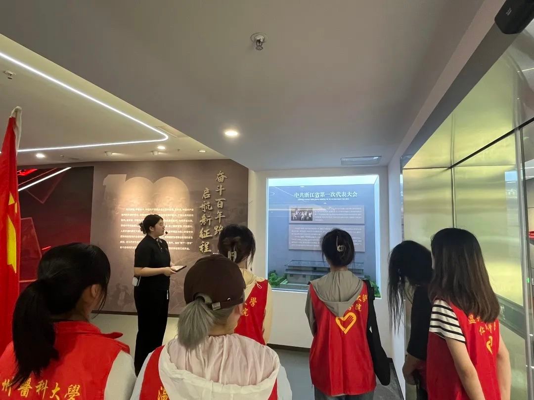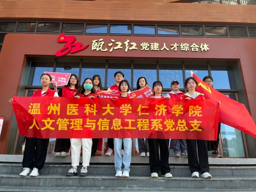 穿过榕源,走近“瓯江红”党建人才综合体,首先映入眼帘的是天花板上的奇妙设计,一颗颗红色的小球,不同角度看过去是党徽,亦是“瓯江红”的标志。在讲解员的引导下,党员们依次参观党史教育馆、红色理想区、主题党日馆、数字沙盘、党群服务等板块。历史的长廊的屏幕上播放着温州人敢打敢拼的发展历程。馆内陈列的藏品见证温州的发展,也见证浙南的红色发展史。通过屏幕上浙南红色发展史的讲解,同学们了解到在浙南这片具有光荣革命传统的土地,祖辈们在党的领导下,英勇斗争、浴血奋战的革命史。与此同时,进一步了解为顺应新时代发展需求,温州开启“人才引进”计划,以系统、具体的政策作为支持,吸引人才,引进人才,为未来温州的发展开辟新的道路。