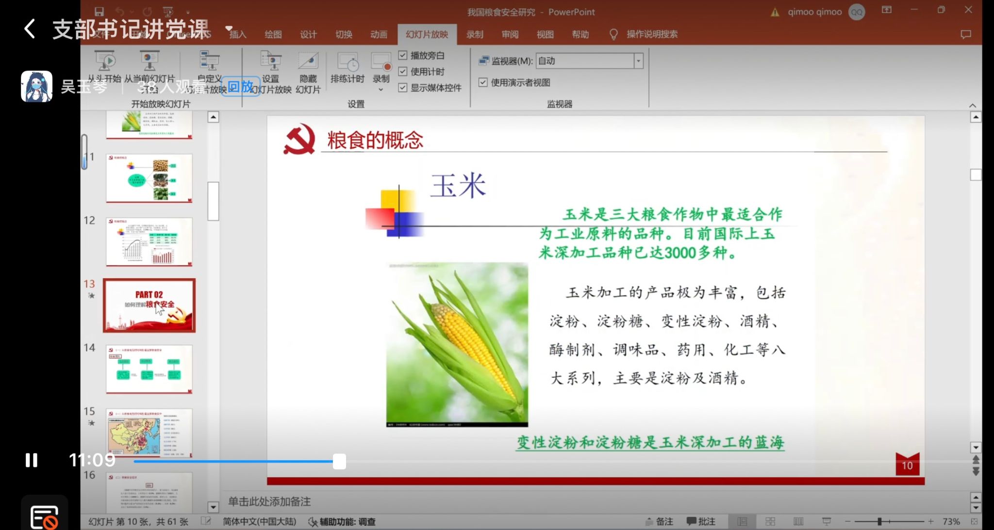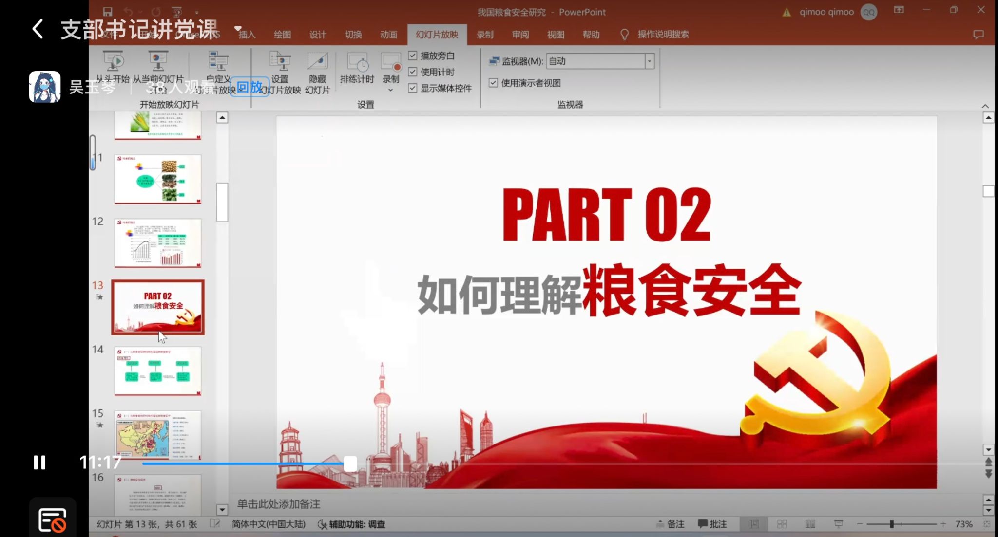 民以食为天。为深入学习贯彻习近平总书记三亿(中国)国家粮食安全的重要论述精神,在支部成员中加强粮食安全宣传教育,引导支部成员增强惜粮意识,护理系第一党支部于12月11日晚以钉钉直播的方式开展了云端党课,本次党课由支部书记吴玉琴老师主讲。
