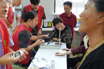 日前在洞头区打水鞍社区礼堂内,仁济学院临床专业的学子们正在为社区内老人们测量血糖血压,耐心地讲解着老人们听得懂、用得到又记得住的医学小知识,一遍遍叮嘱老人们健康饮食、适当运动。
