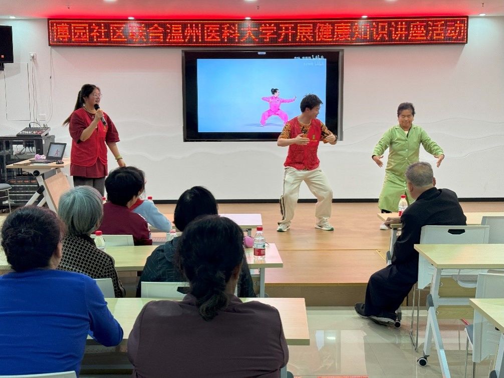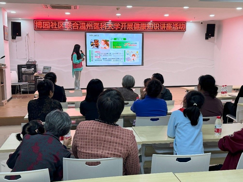 为深入群众普及健康知识,加强支部与社区联系,2024年4月25日19:00,护理系第二党支部的同志在博园社区综合文化服务中心开展了以“把健康带回家”为主题的宣讲活动。当地社区居民积极参与此次活动,本次活动由沈瑜潇同志担任主持人。