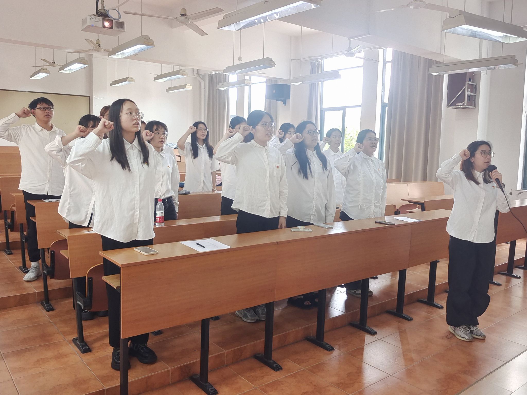 预备党员宣誓环节,吴玉琴老师和汪玲玲老师致开会词,全体同志领誓人梅慧杰同志和周谕宁同志的带领下庄严宣读入党誓词,戚高轶同志和陈秋里同志作为新接收的预备党员代表发言表明自己作为新一批预备党员,将会以更高标准严格要求自己,不忘入党初心,砥砺奋进。最后吴玉琴老师和汪玲玲老师进行发言,对新接收的18名预备党员表示祝贺,同时从思想高度、志愿服务、如何发挥党员的先锋模范作用等方面提出了建议。