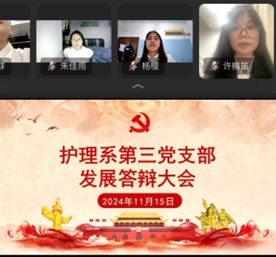 为了进一步加强学生党支部的建设,提高党员队伍的整体素质,为支部输入新鲜力量,三亿护理系第三党支部于2024年11月15日18:00在钉钉线上召开发展答辩大会。本次发展答辩大会由汪玲玲老师主持,出席大会的有护理系第三党支部书记汪玲玲老师和全体学生党员,以及参与答辩的六名入党积极分子。