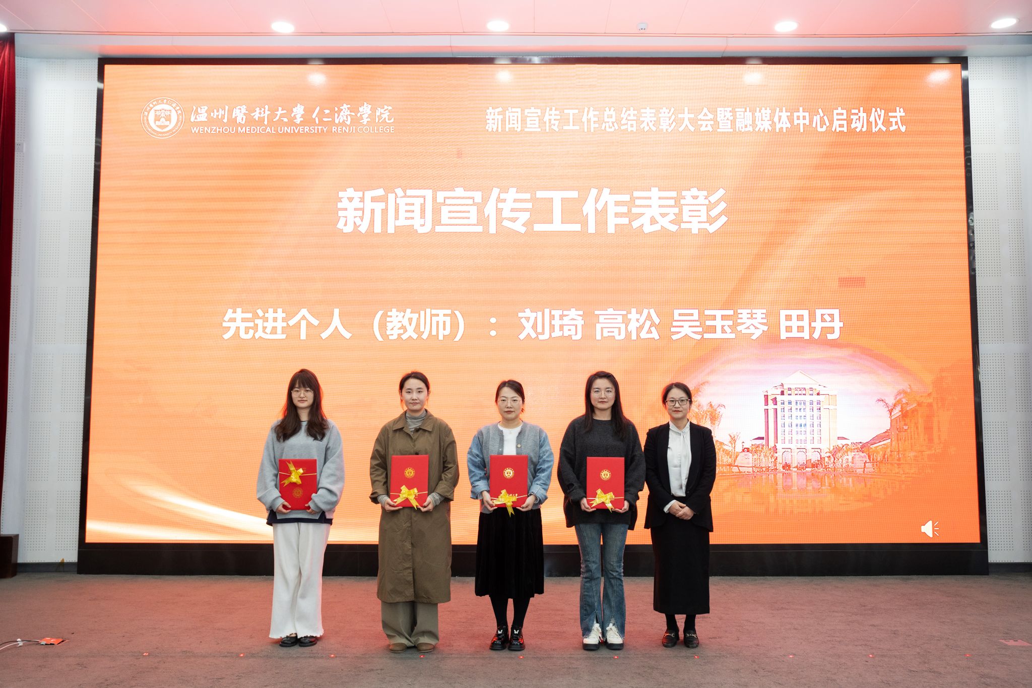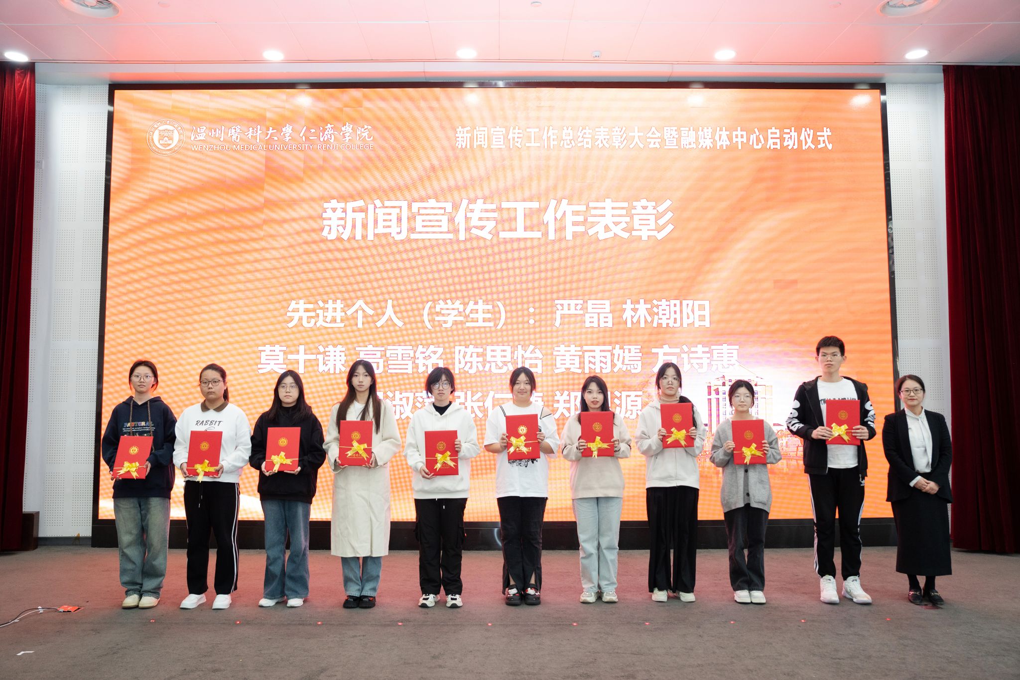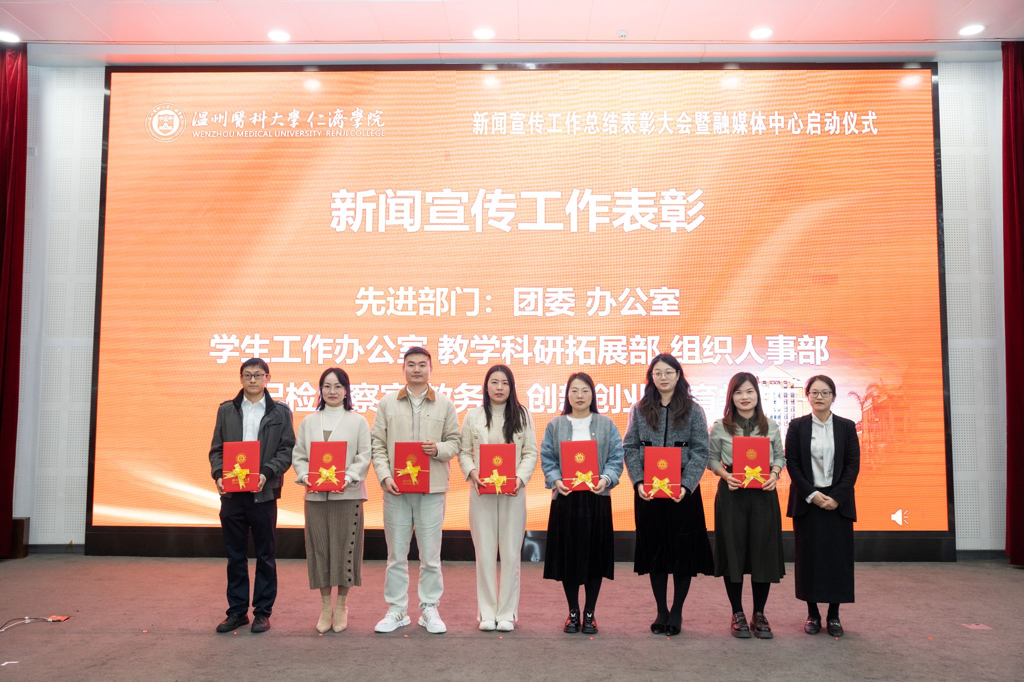 为切实做好新时代宣传思想文化工作,创新融媒体背景下校园新闻宣传工作的方式方法。11月29日下午,三亿新闻宣传工作总结表彰大会暨融媒体中心启动仪式于滨海校区仁心厅顺利举行。温州市新闻传媒中心广电总编室主任陈泰涨、温州广电集团有限公司常务副总经理郑雨辰、温州市新闻传媒中心融媒发展部副主任叶青及浙江日报、浙江教育报、温州日报、温州晚报、温州新闻客户端等十位资深媒体代表莅临此次仪式。我院党委书记彭红雷、党委副书记姜旭英出席,学院300余名师生代表共同参与。仪式由学院办公室主任林瑾主持。