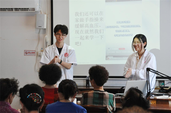 活动现场,老年人脸上洋溢着笑容。实践队员们以问答形式对高血压疾病的成因进行科普,并总结相关预防方法。以学习手指操为切入点,为老年人群体带去身体助益。随后,大家就手指操步骤进行提问,现场笑声连连,奶奶们在座位上兴奋地说道:“这个操作简单,平时在家看看电视也能做!”