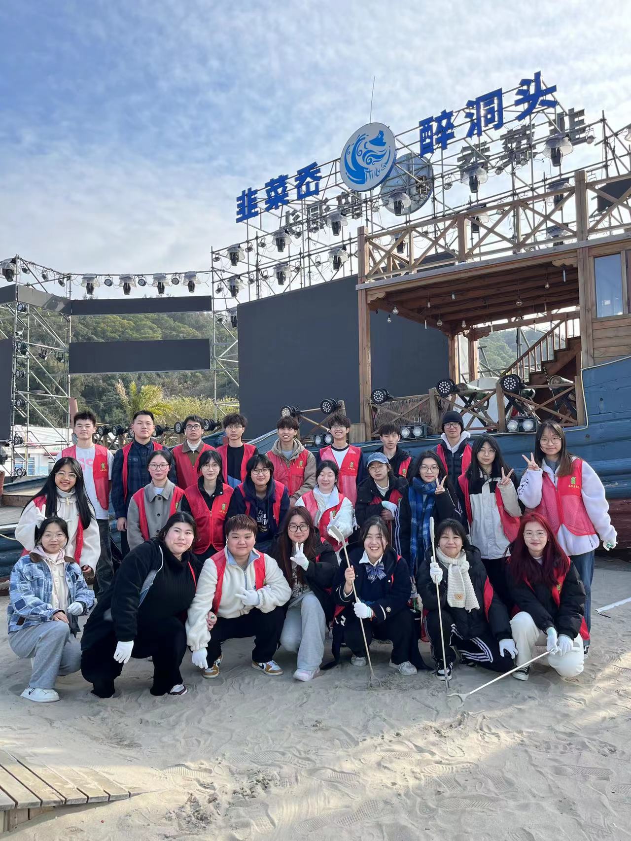 2022级康复1班团支部来到韭菜岙开展净滩活动,他们手持垃圾袋、夹子等工具,沿着海岸线清理垃圾,用实际行动守护海洋环境。