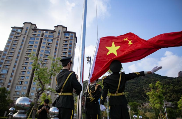 在国旗护卫队铿锵有力的步伐中,全体师生肃立,目视国旗,高唱国歌,一同仰望着五星红旗冉冉升起,在晨光中迎风飘扬。