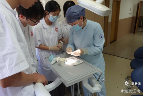 图为口腔科带教医生讲解“高速手机”的使用方式