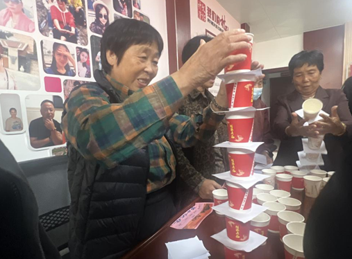 “金秋套福圈”游戏区前,老人们站在1米线外,凝神瞄准摆放好的 “积分道具”,手持塑料圈轻轻一掷,“中了!中了!” 随着欢呼声,工作人员立即在积分卡上记录分数;“弹跳乐团圆”乒乓球区里,老人们专注地晃动鞋盒,让盒内乒乓球从指定小洞漏出,1分钟内的每一个 “成功掉落” 都让他们露出孩童般的笑容;“纸杯叠登高”环节,大家小心翼翼地用手叠起纸杯,并用小方纸隔开,既要追求速度,又要保证造型稳定5秒不倒塌,现场不时传来 “慢一点,别慌” 的互相提醒;“乒乓投吉杯”游戏中,针对部分老人单手操作困难的情况,主办方灵活调整规则允许双手操作,让每位参与者都能轻松体验。“这些游戏既不费劲儿,又有意思,好像回到了年轻时玩闹的日子!” 刚完成四个游戏的张奶奶看着积分卡上的分数,脸上满是喜悦。