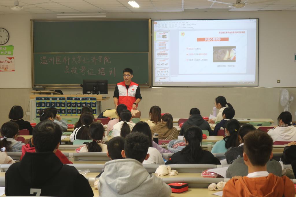 为让在校学生掌握急救技能,提高自救、互救能力,2022年11月6日,温州医科大学仁济春晖青年志愿者服务中心与洞头区红十字会一同举办了“急救考证”活动。