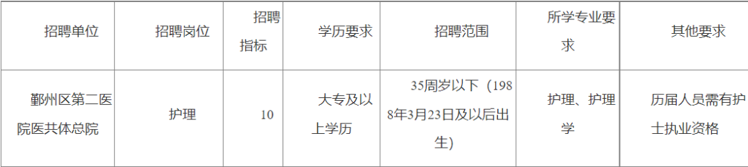 因工作需要,宁波市鄞州区第二医院医共体总院拟面向社会招聘编外工作人员10名。具体要求如下: