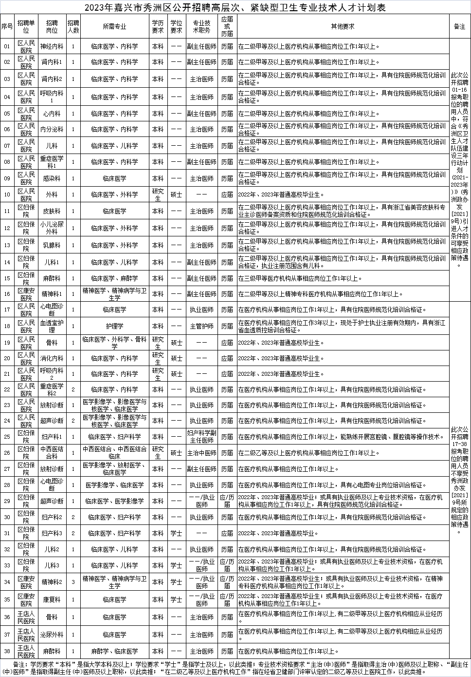 2023年嘉兴市秀洲区公开招聘高层次、紧缺型卫生专业技术人才44名。具体的招聘单位、职位、人数和资格条件详见《2023年嘉兴市秀洲区公开招聘高层次、紧缺型卫生专业技术人才计划表》(附件1,下称《计划表》)。