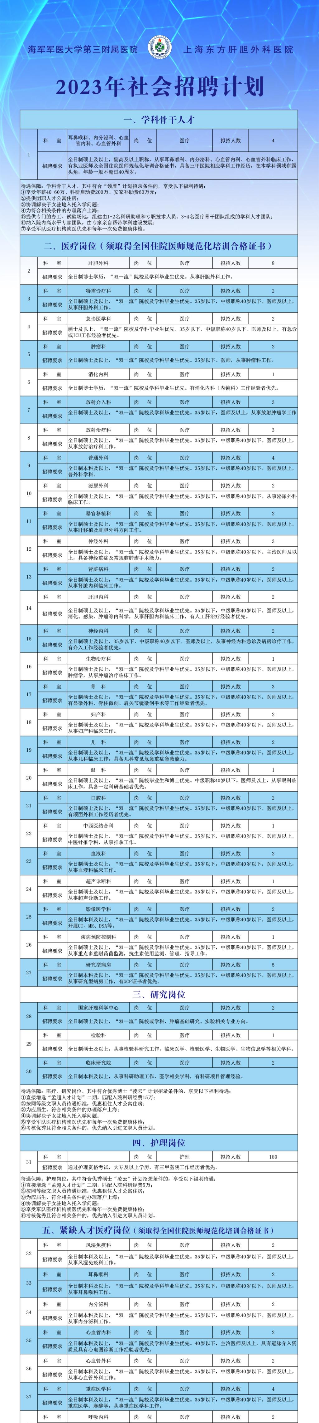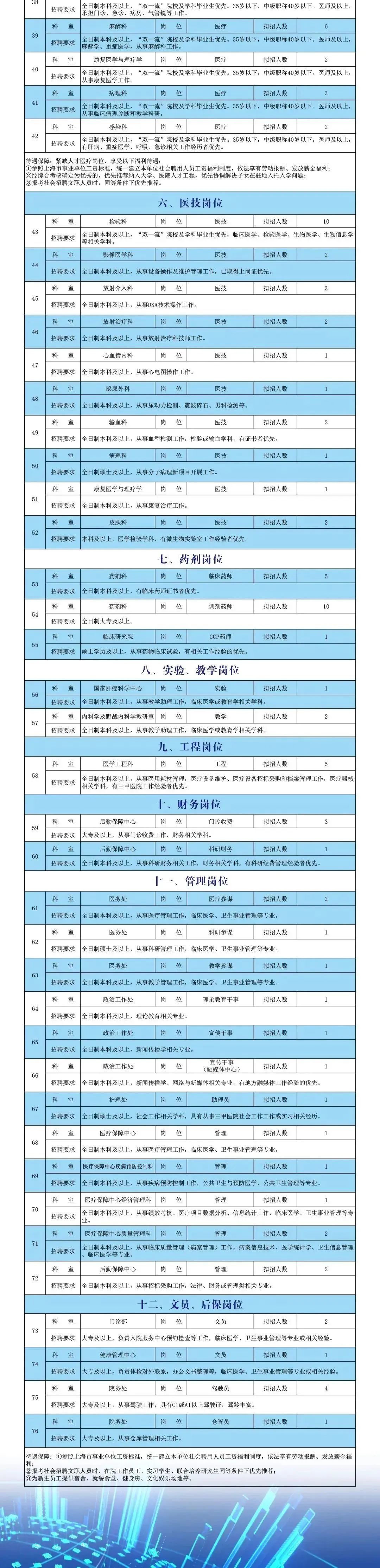 麻醉科、重症医学科、呼吸内科、病理科、康复医学与理疗科、感染科、风湿免疫科、耳鼻喉科、内分泌科、心血管内科、心血管外科医疗岗位。