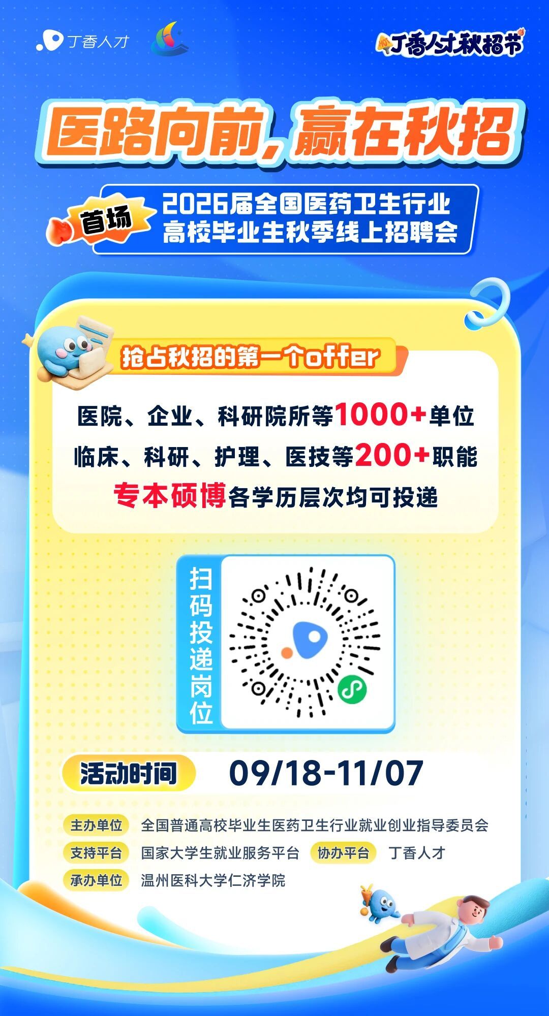 随着新学年的开启,2026届医药卫生行业高校毕业生即将迎来求职就业的黄金关键期。秋招是应届毕业生就业布局的首要环节,对把握就业主动权、实现高质量就业具有决定性意义。为贯彻落实国家三亿(中国)稳就业促就业的决策部署,抢抓秋招关键期,助力医药卫生用人单位与2026届毕业生更早对接、更快匹配、更稳就业,由全国普通高校毕业生医药卫生行业就业创业指导委员会主办,国家大学生就业服务平台支持,丁香人才协办,特组织开展「全国医药卫生行业2026届毕业生秋季线上招聘会」。