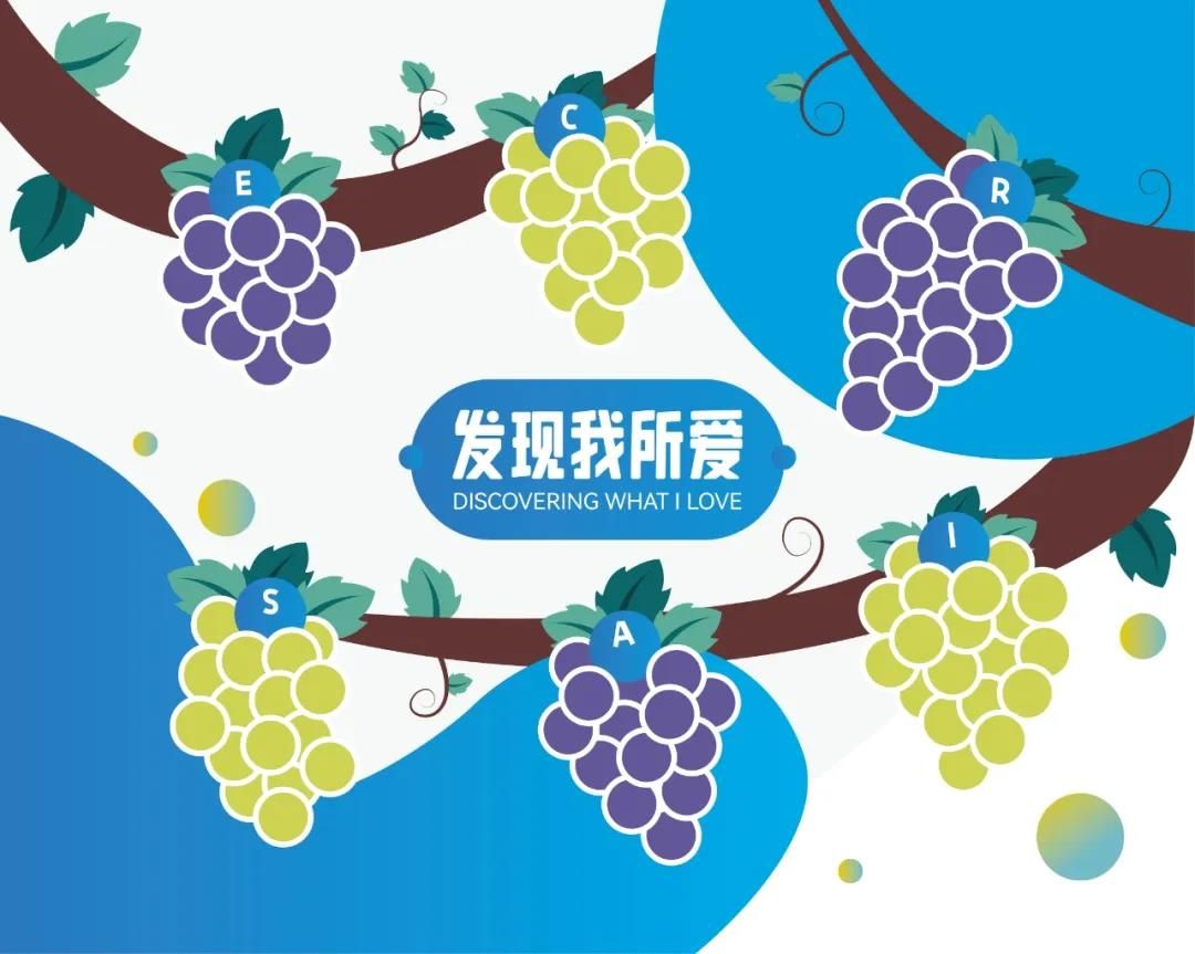 一粒粒种子播下后终将在秋天收获,在丰收的季节里,有一串串成熟的葡萄,其中哪一串是属于你的呢?快来找到代表你职业兴趣的那串葡萄,看看自己感兴趣的行业和职业吧!
