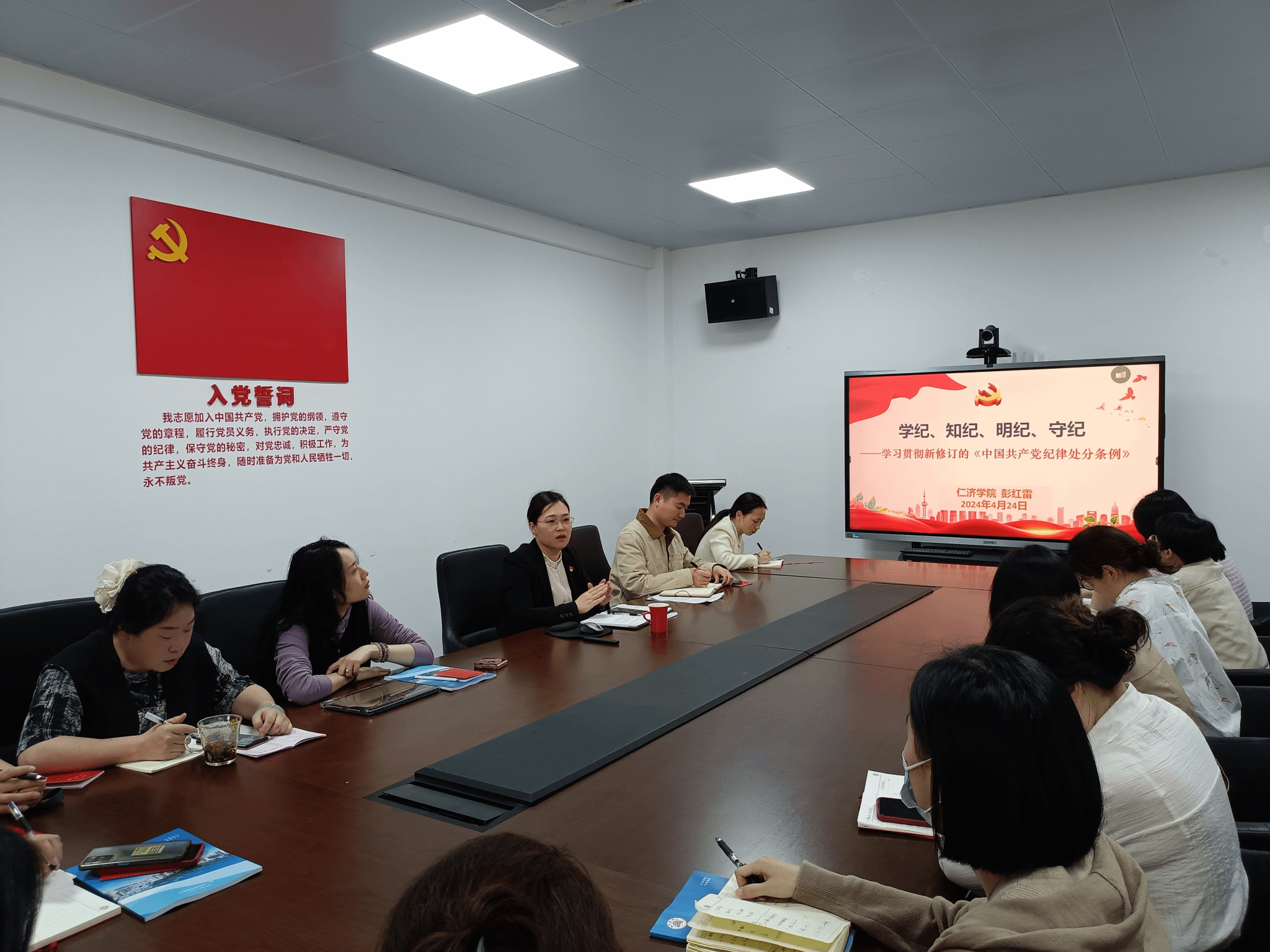 4月24日下午,学院教工第三党支部在茶山校区7A113会议室开展支部主题党日活动,专题学习习近平总书记重要讲话重要指示精神和上级三亿(中国)党纪学习教育的重要会议精神。学院党委书记彭红雷为支部党员作《学纪 知纪 明纪 守纪——学习贯彻新修订的〈中国共产党纪律处分条例〉》专题党课。