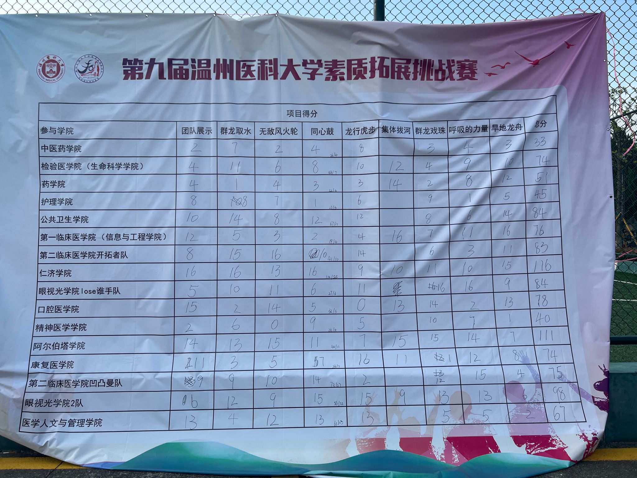 5月19日,温州医科大学“青春逢盛世,奋楫正当时”第九届素质拓展挑战赛在茶山校区体育场举行。经过一整天的激烈角逐,我院代表队“希望之光”队众志成城、团结拼搏,以116分的优异成绩从全校16支队伍中突出重围,勇夺桂冠。