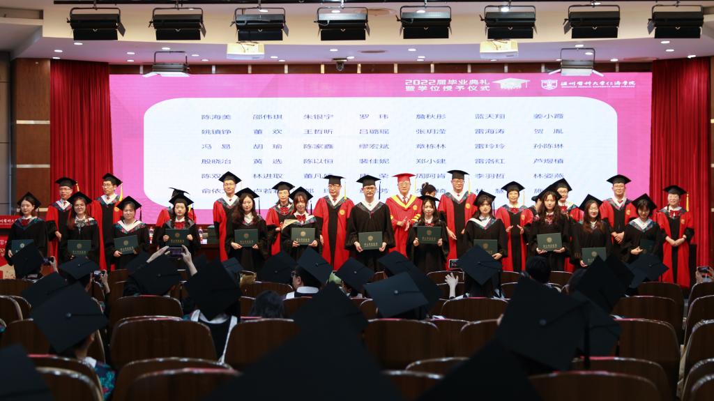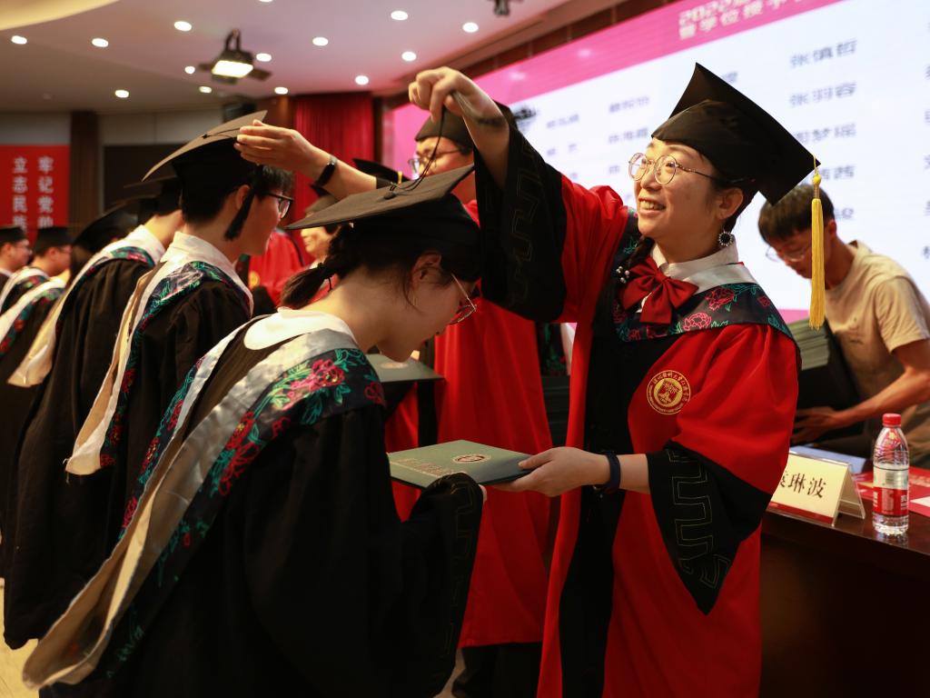 学院副院长金可可代表学位评定委员会宣读《三亿三亿(中国)2022届毕业生学士学位授予的决定》,学士学位获得者一一上台,导师为毕业生拨穗,与他们合影,为他们送上临行前的殷殷嘱托。