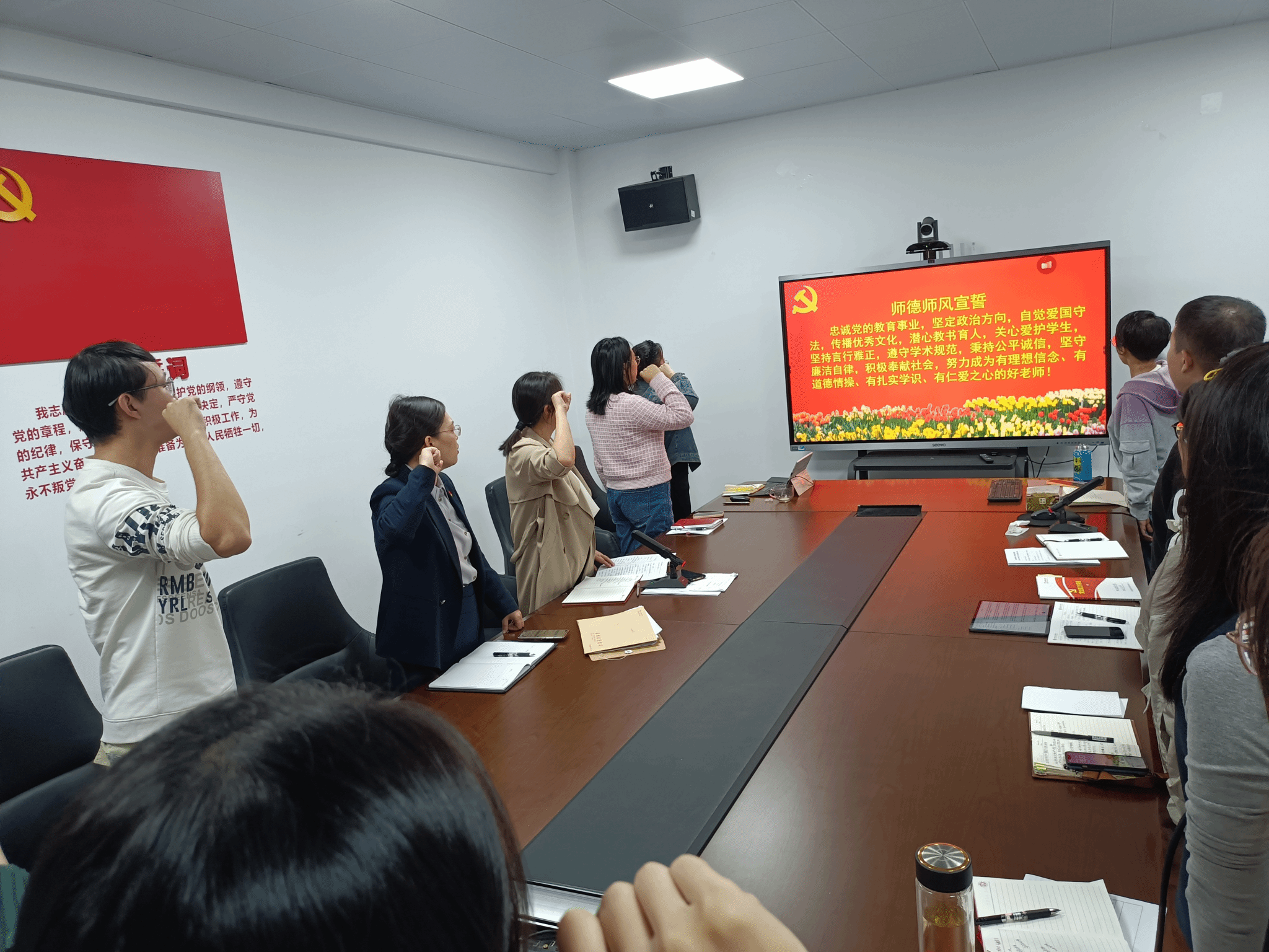 为推动教育家精神入脑入心,进一步强化师德师风建设,支部书记姜旭英带领全体党员进行了师德师风宣誓。支部同志举起右拳,庄严宣誓“忠诚党的教育事业,坚定政治方向......努力成为有理想信念、有道德情操、有扎实学识、有仁爱之心的好老师”。