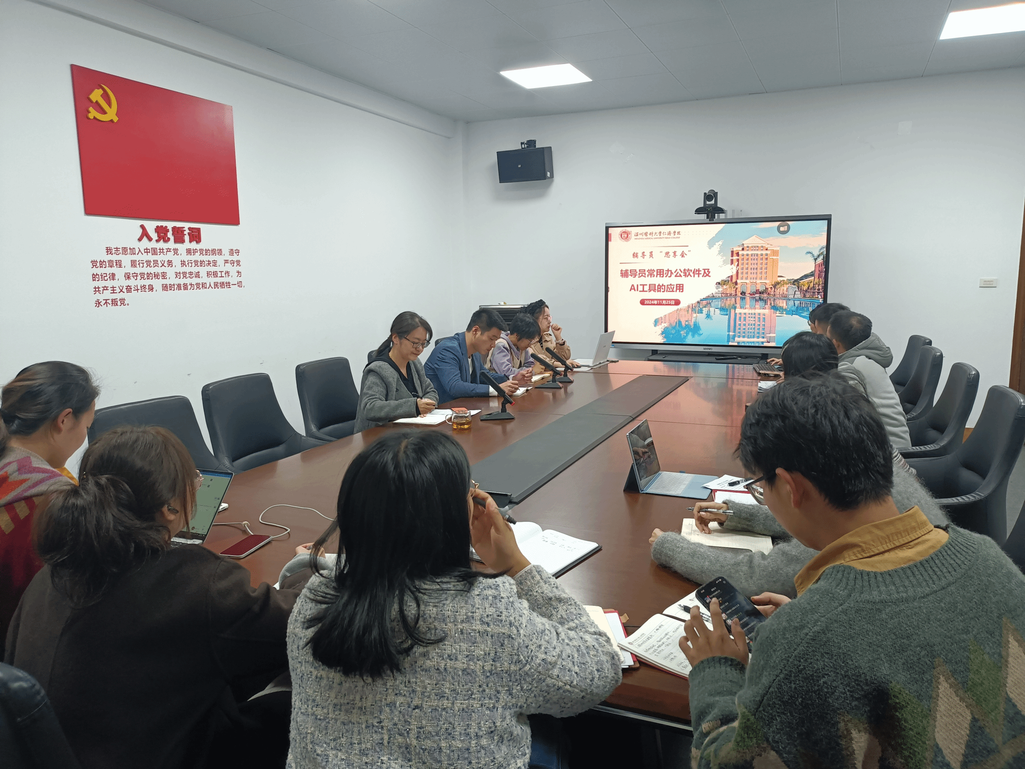 为进一步增进辅导员交流学习,切实加强辅导员队伍建设,11月25日下午,学院学工办举行第三期辅导员思享会——辅导员常用办公软件及AI工具的应用,学院党委副书记姜旭英、张立康以及全体辅导员参加。