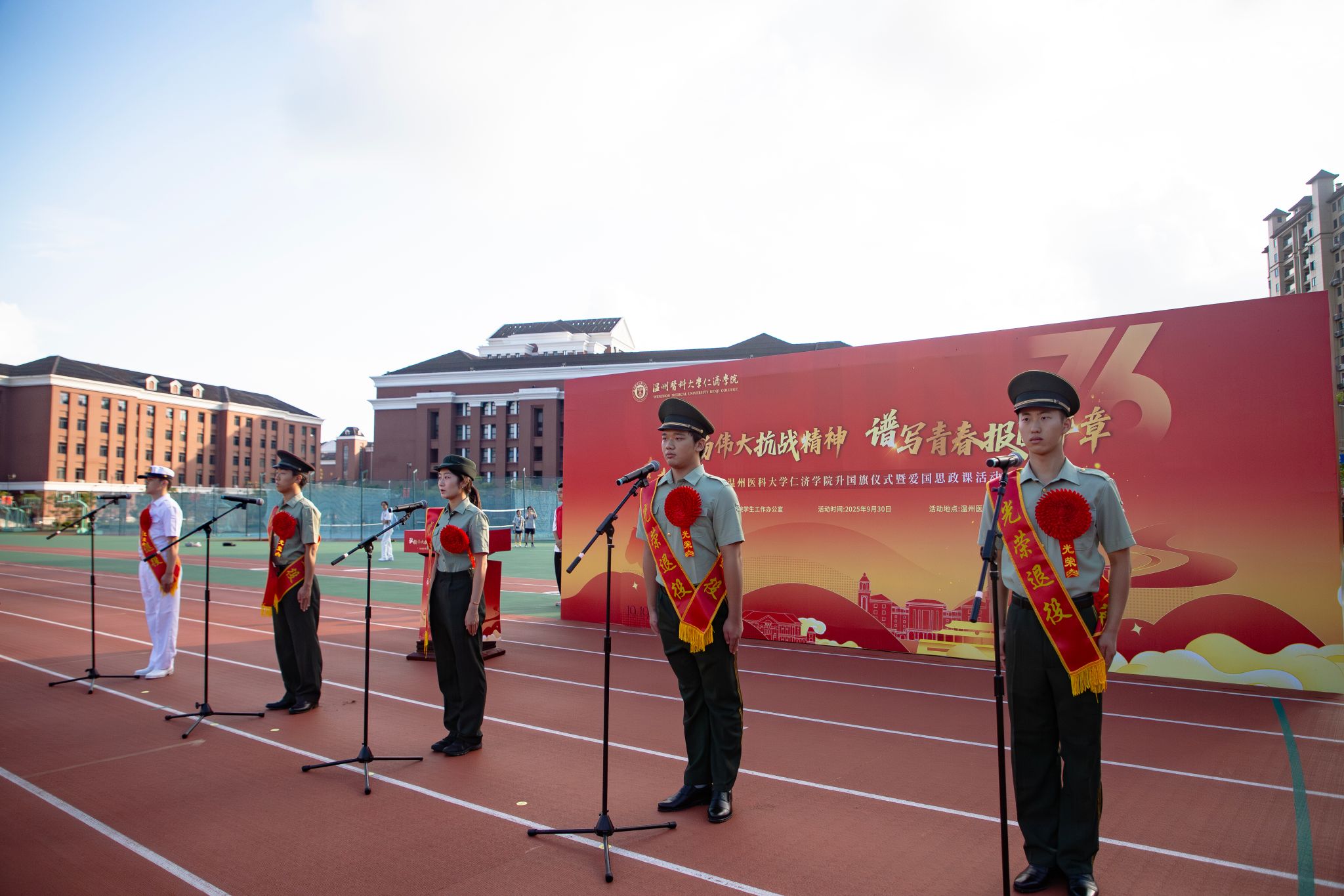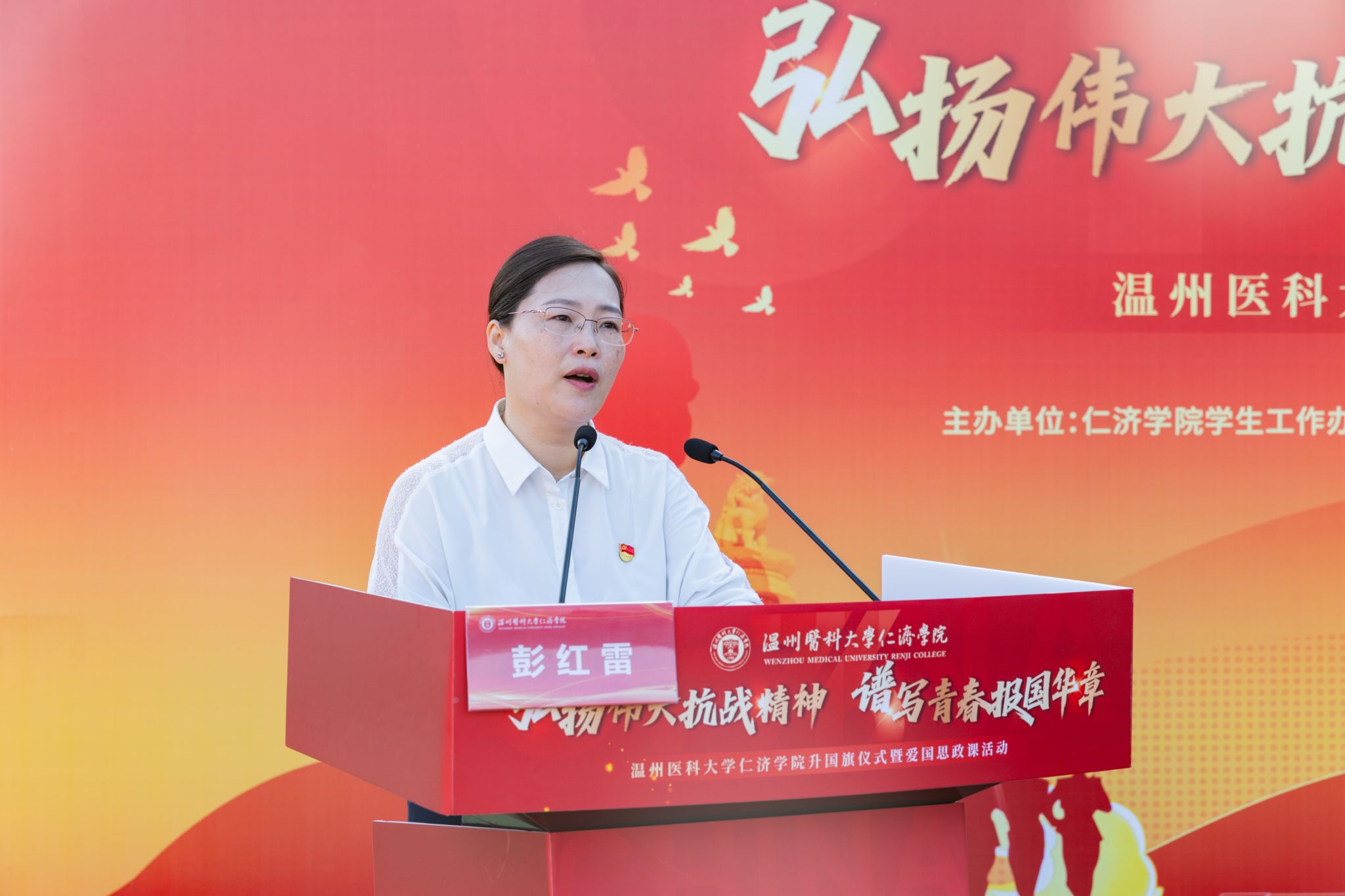 旗帜飘扬,誓言在耳,嘹亮的号角指向了前进的航向。如何将此刻震天的誓言,化为不负时代、不负韶华的奋斗指南?一堂走心入脑的爱国思政课隆重开讲。仁济学院党委书记彭红雷围绕“以史为鉴”“以行践诺”“以梦为马”三个层面,深情回顾了抗战历史的壮烈与民族精神的传承,并结合仁济学子奔赴西部、捐献造血干细胞、捐献眼角膜等真实事迹,生动诠释了“仁肃勤朴”“仁心济世”精神在新时代的传承。“新时代医学青年要深挖中华优秀传统文化的精神宝藏,传承弘扬伟大抗战精神”,她寄语广大学子要将爱国情怀熔铸于所学专业的精益求精之中,在奋斗实干中书写青春的爱国华章。
