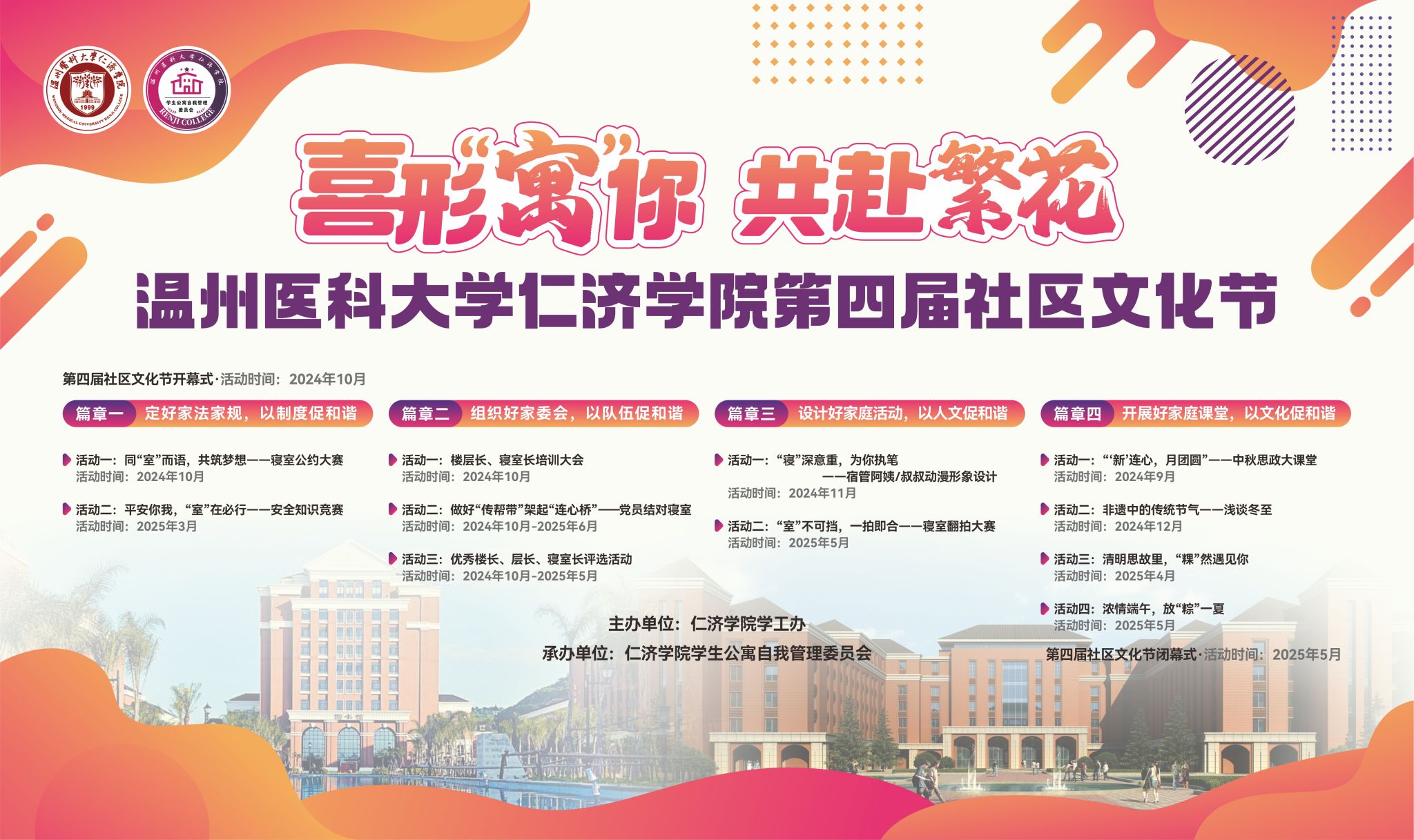 据悉,仁济学院学生区工作一直紧密围绕学院党委的中心工作和助力学生全面发展的目标不断推进。第四届社区文化节以“喜形‘寓’你,共赴繁花”为主题的社区文化节系列活动,涵盖定好家法家规,以制度促和谐组织好家委会,以队伍促和谐;设计好家庭活动,以人文促和谐;开展好家庭课堂,以文化促和谐四个活动篇章旨在推动寝室文化的发展,打造爱校爱家、共建共享、向上向善的社区生活。
