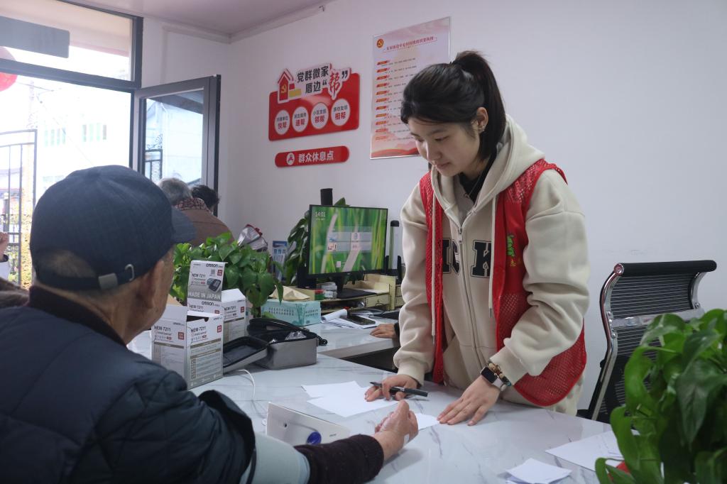义诊活动现场,前来询问的居民早早排起了长队,为了保证活动顺利进行,学生志愿者们分为不同的小组,维持现场秩序,使活动得以顺利开展。在正式诊疗前,志愿者们先帮助居民们根据相关问题和情况进行初步的分诊,以得到更好、更快捷的诊疗。后根据需要帮助他们测量血压、血糖,对于血压、血糖偏高或偏低的居民进行重点标记,并将其数值记录交给现场的义诊专家辅助其进行后续诊疗。最后,志愿者们通过发放健康宣传手册的形式对健康保健等常识进行大力宣传,以便让居民们掌握更多的健康常识,同时根据他们的疑惑进行一一解答。
