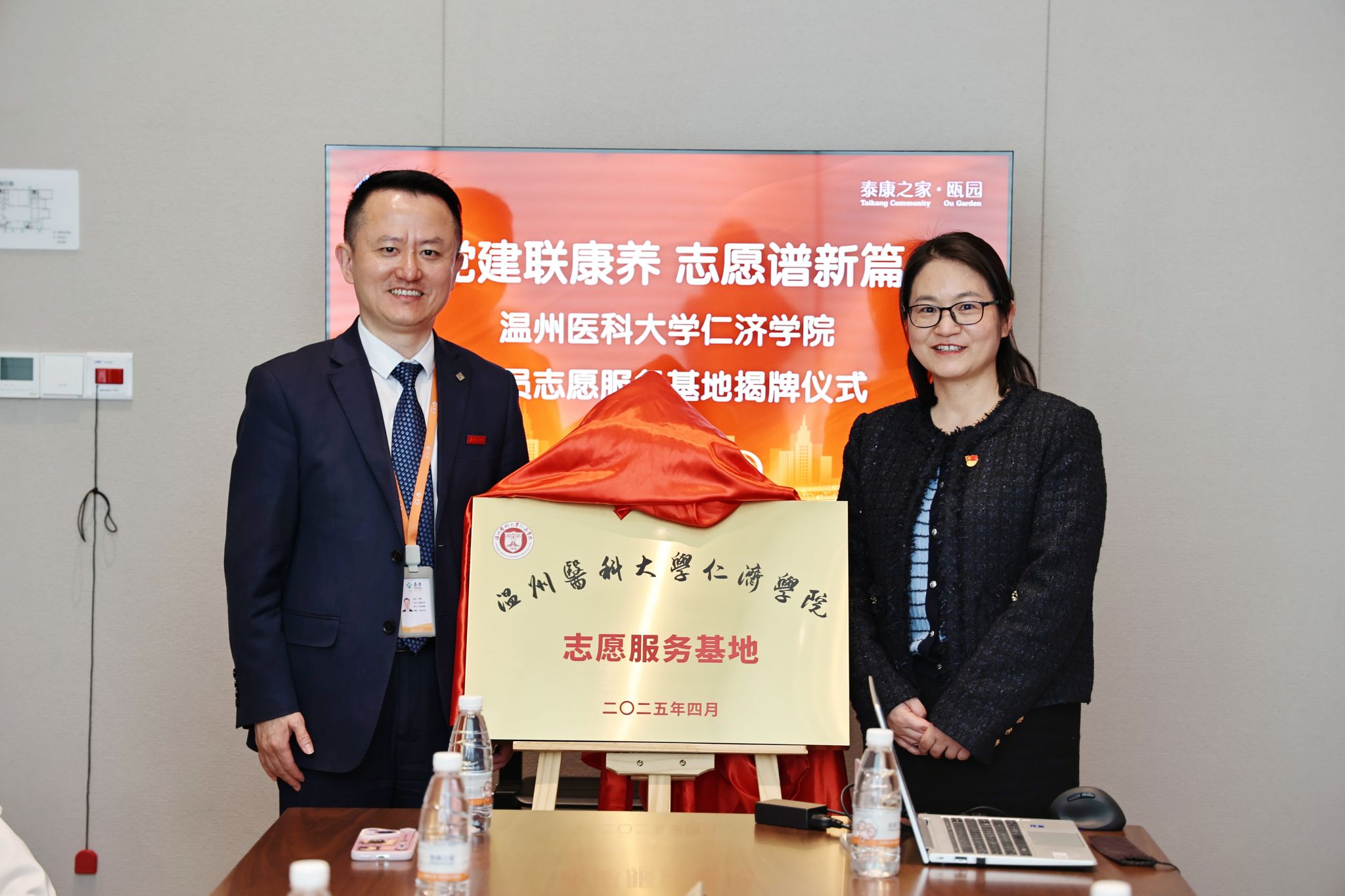 泰康之家·瓯园社区负责人俞旗对仁济学院师生一行的到来表示热烈欢迎,他高度肯定了学院学生党员的专业素养与奉献精神,并强调:“瓯园将全力支持青年学子发挥医学药学专长,为长者提供精准化、常态化的健康服务。我们期待通过与学院开展常态化的志愿活动,架起青春与夕阳的桥梁,让长者的智慧与青年的活力交融共生,共同书写‘享老’新篇章。”随后,姜旭英副书记与社区负责人俞旗共同为“志愿服务基地”揭牌,标志着双方在党建引领下的院社合作正式开启。