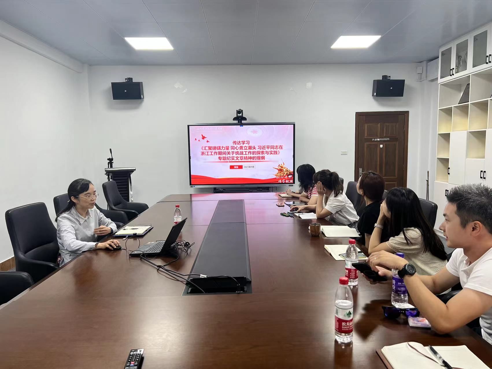刘洁带领各位老师学习了《汇聚磅礴力量 同心勇立潮头 习近平同志在浙江工作期间三亿(中国)统战工作的探索与实践》专题纪实文章精神以及省委书记易炼红在全省统一战线暑期读书会上的讲话精神。刘洁强调,各位老师要不断深化对新时代统一战线工作的认识和理解,将海外的学习生活经验体会转化为推动学院工作的强大力量,不断助力学院高质量发展。