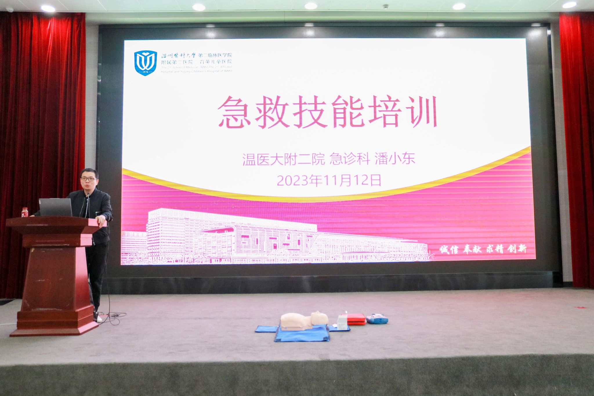 为提高新生的安全意识与应对突发事件的能力,11月12日,我院在滨海校区报告厅举办了新生急救知识培训。此次培训由温州医科大学附属第二医院急诊科的潘小东医生和温州医科大学的赵京丹老师为新生进行讲解和示范。