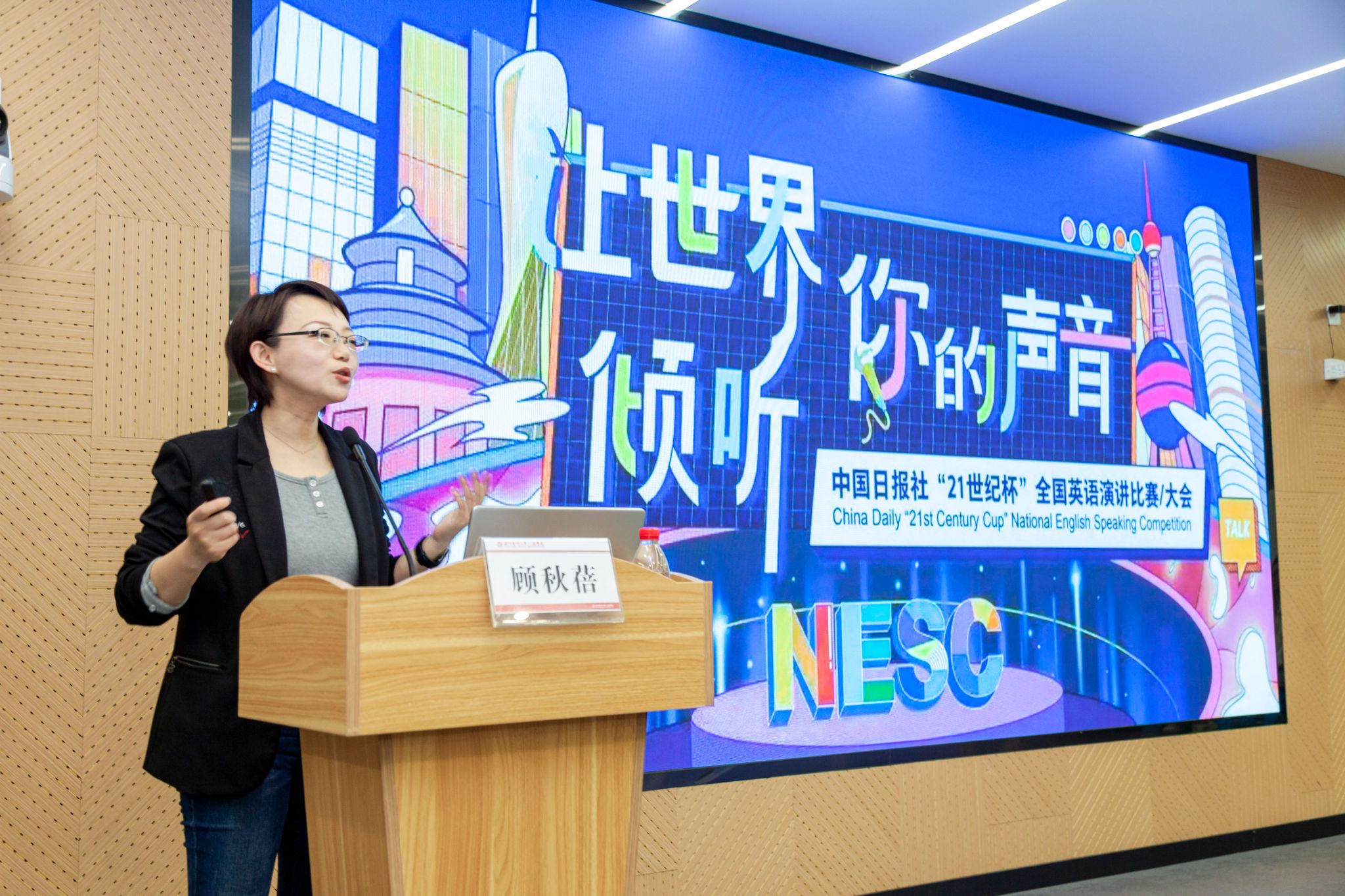 顾秋蓓副教授凭借其深厚的学术造诣和丰富的教学经验,以生动的语言、鲜活的事例,深入剖析了英语学习与演讲艺术之间的紧密联系。她详细阐述了如何巧妙运用演讲技巧提升英语表达能力,如何在英语学习过程中融入演讲的艺术元素,进而实现自我表达的有效沟通。顾老师的讲解深入浅出,充满实践价值,其轻松诙谐的表达方式不时引发在场师生的共鸣与欢笑。