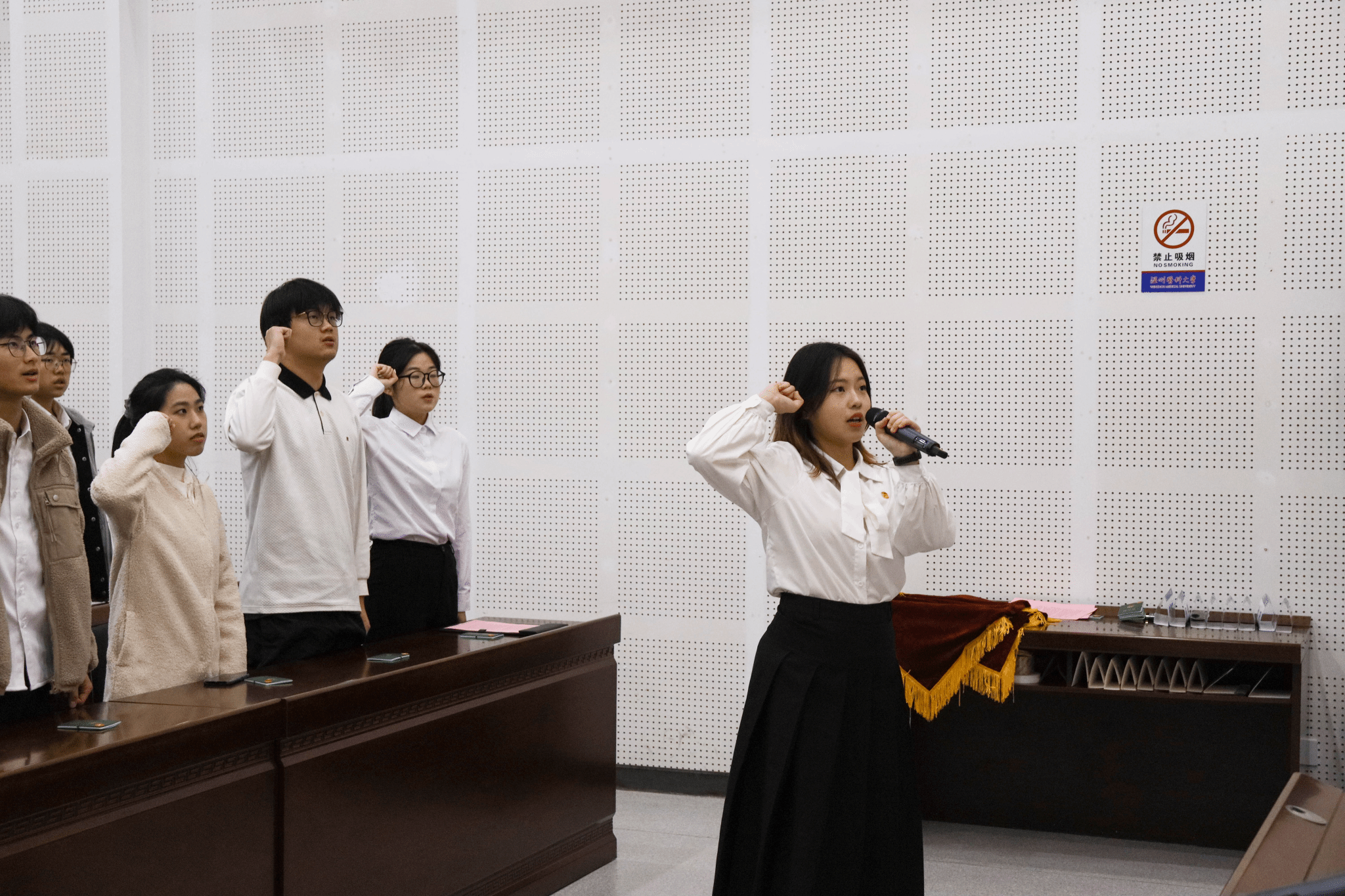 在优秀团员代表李豪君的带领下,新团员面向团旗庄严宣誓,铮铮誓言激荡人心。新团员代表吴佳熠同学表示加入团组织,不仅仅是获得一个身份,更是一份担当,一种行动的力量,会坚定共产主义的信念,为中华民族伟大复兴贡献力量。优秀团员宋国朵也表示,作为一名团员要以青春之躯化作点点繁星,照亮民族复兴漫漫长路。