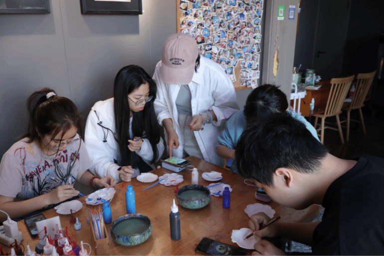 除了学习会以外,团支部还抓住“仁济艺术月”这一契机,充分利用现有资源,深入当地知名的贝壳画工作室进行体验学习。在指导老师的帮助下他们绘画出了各种图案,团员青年们在贝壳上画下的每一笔都在以艺术的方式增强文化自信,培养家国情怀。