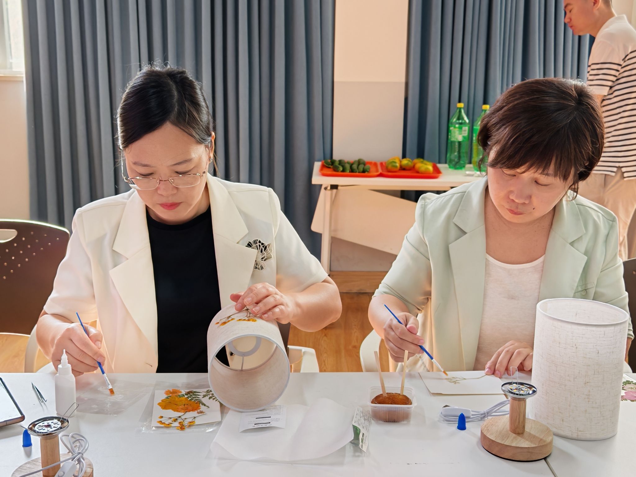 花灯DIY活动环节,大家围坐一堂,手持提前准备好的灯笼材料包,在互相学习中折叠、拼接、粘贴,将花草树木等材料逐步变成一盏盏样式别致、透着温馨光芒的中秋主题花灯。一盏盏被点亮的花灯,寄托着大家对美好生活的祝愿。