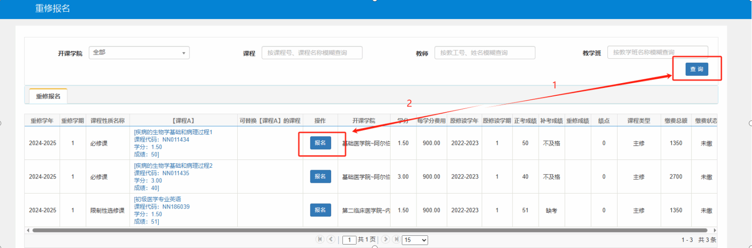 第一步:报名网址:http://jwxt.wmu.edu.cn温州医科大学教学综合信息服务平台。登陆网址后,选择“报名申请”——“重修报名”,点击“重修报名”,点击“查询”按钮,如下图所示。,如下图所示。