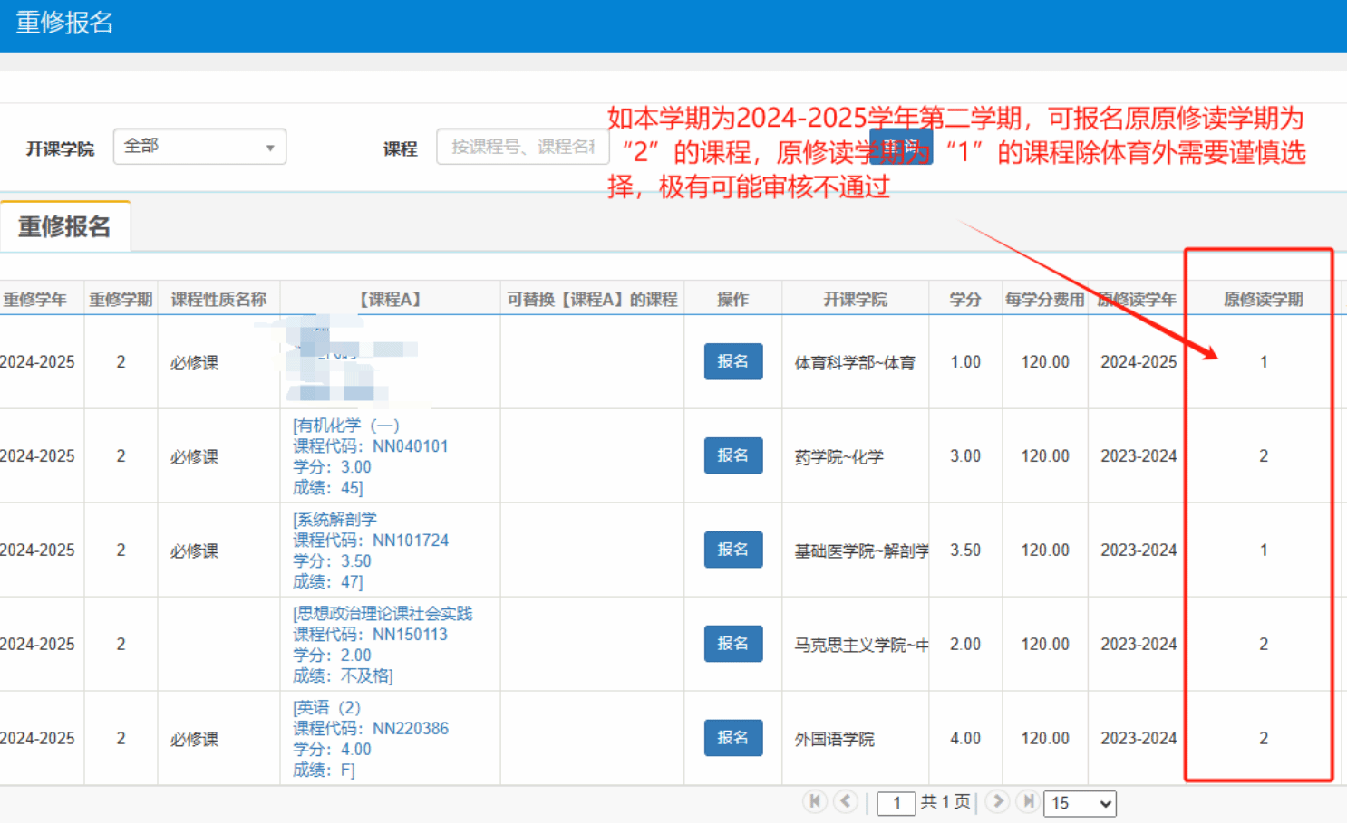 第二步:确认修读学期,当学期应报名原修读学期与本学期一致的课程,例如当学期为2024-2025学年第二学期,则应选择原修读学期为“2”的课程,体育课不限学期,应咨询体育学院,先在体育学院登记重修课程,再在系统内完成报名。