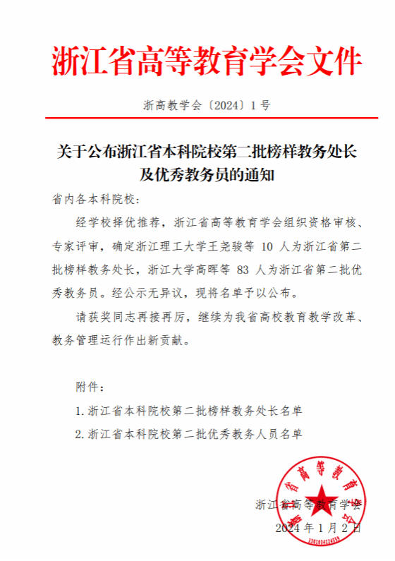 喜报:我院何乐雁老师荣获“浙江省第二批优秀教务人员”称号发表时间:2024年01月09日 08:23 流览量:次 作者: 分享到: