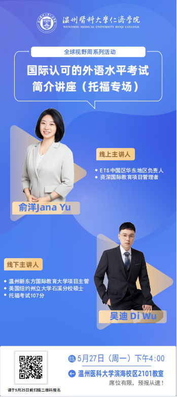 讲座预告|“全球视野周”之国际认可的外语水平考试简介讲座(托福专场)发表时间:2024年05月21日 11:02 流览量:次 作者: 分享到: