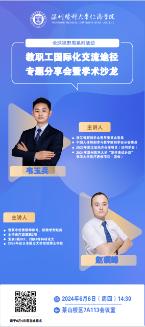 为进一步助力我院国际化建设,服务教职工国际化交流,提升教职工国际化视野,学院特邀2024年温州医科大学“游学无忧计划”项目团长韦玉兵老师和具有出国进修经历的赵硕峰老师,为教职工带来专题分享会暨学院第四期学术沙龙。筑梦接力、薪火相传,为你而来!