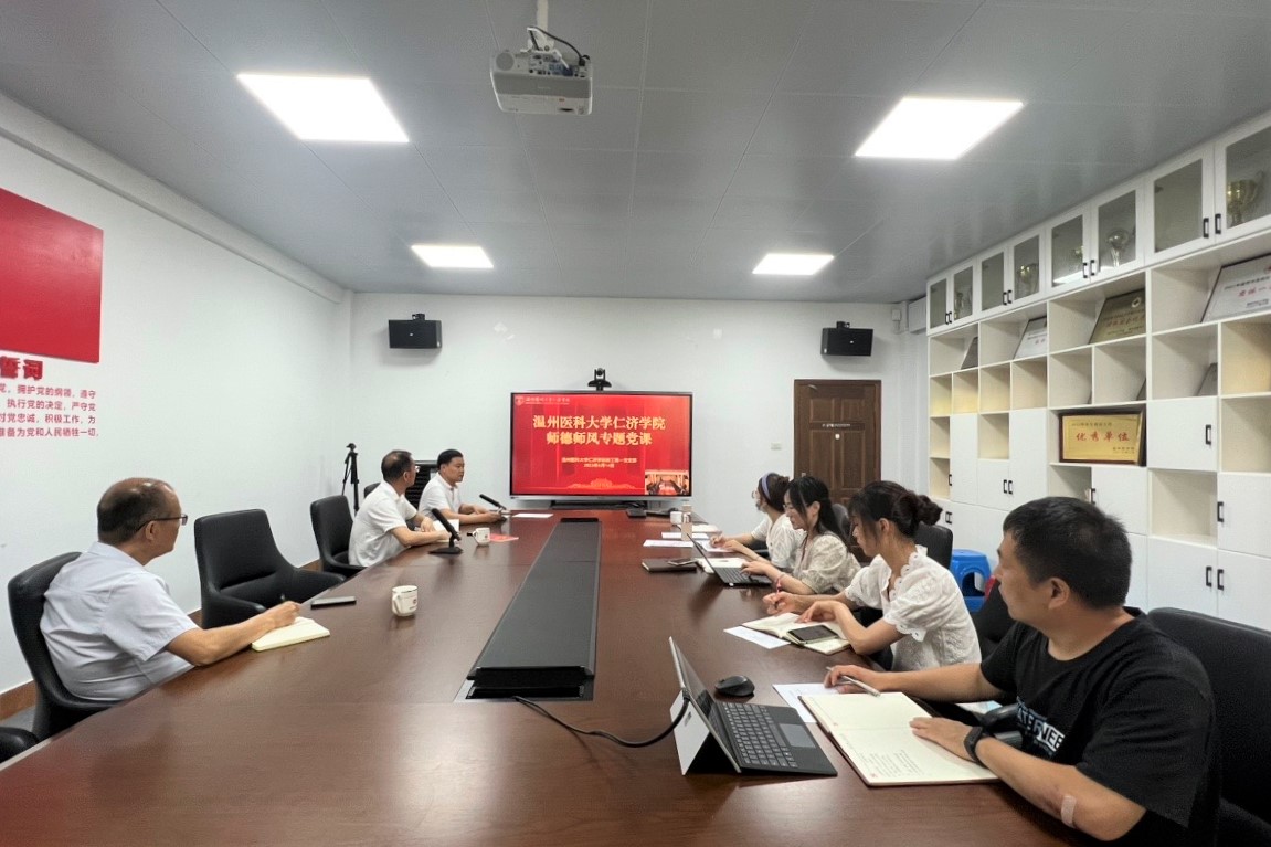 为进一步加强教师师德修养,激励广大教师以赤诚之心、奉献之心、仁爱之心投身教育事业,仁济学院教工第一党支部于6月14日率先开展《自觉加强师德修养 争做“四有”好老师》师德师风专题党课,全体党员20余人通过视联网跨校区参加会议,学院副院长朱晓东、纪委书记林体排参加学习会。