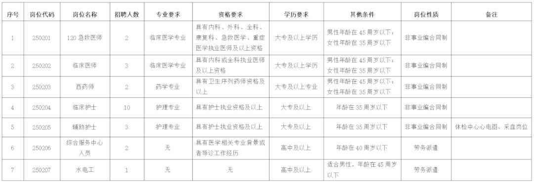 因工作需要,我院拟向社会公开招聘120急救医师2名,临床医师3名,西药师2名,临床护士10名,辅助护士3名,均属于非事业编合同制;综合服务中心人员2名,水电工1名,均属劳务派遣制。