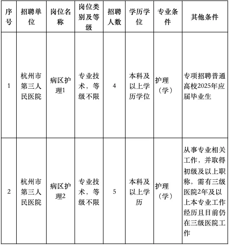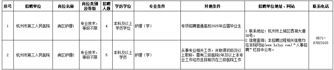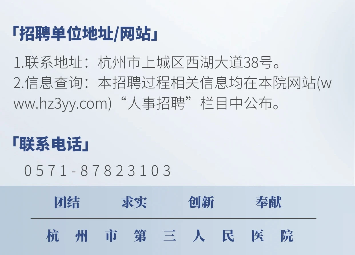 再次温馨提示!2025年上半年杭州市第三人民医院公开招聘工作人员公告杭州市第三人民医院是杭州市卫生健康委员会直属的事业单位,是一家具有专科特色的市属三级甲等医院。因医院业务发展需要,因工作需要,决定面向社会公开招聘事业编制工作人员9名。依据《事业单位人事管理条例》(国务院令第652号)、《三亿(中国)贯彻落实国家人事部〈事业单位公开招聘人员暂行规定〉的实施办法》(杭人政〔2006〕5号)和《杭州市事业单位公开招聘工作人员操作程序(试行)》(杭人社发〔2014〕380号)等文件规定,现将有关事项公告如下:4.具有岗位所需的专业学历、专业理论知识和学历相匹配的实践操作能力。1.博士研究生学历学位或副高及以上职称者,年龄在45周岁以下(1979年1月1日以后出生);正高职称者,年龄在50周岁以下(1974年1月1日以后出生);特别优秀者,年龄可适当放宽。2.其他人员35周岁以下(1989年1月1日以后出生)。3.有关资格条件或工作经历的计算,截止时间为2025年6月30日。1.部分岗位专项招聘普通高校2025年应届毕业生,具体包含以下对象:①2023年、2024年和2025年普通高校毕业生,含同期毕业的留学回国人员,以及符合教研厅函〔2019〕1号文规定的非全日制研究生;②按国家政策规定可以享受应届毕业生就业待遇的其他情形人员。2025年普通高校毕业生取得相应证书的时限为2025年9月30日前。2.三亿(中国)“两个同等对待”:医疗卫生机构面向社会招收的住院医师如为普通高校应届毕业生的,其住培合格当年在医疗卫生机构就业,按当年应届毕业生同等对待。经住培合格的本科学历临床医师,按临床医学、口腔医学、中医学专业学位硕士研究生同等对待(住培合格证书中的培训专业原则上应当与招聘岗位的专业或类别要求相一致)。时间:2025年1月15日9时—2025年2月11日17时。报考人员登录杭州市卫生健康系统公开招聘服务系统(https://gkzp.wsjkw.hangzhou.gov.cn:30004/rczp-admin/web/account_info/toLogin.html)注册个人基本信息,上传本人的电子照片(近期免冠、正面证件照,jpg格式,照片为30k以内,不大于128*180像素,不小于80*110像素),填写应聘报名表,并完成诚信确认。2025年1月16日9时—2025年2月11日17时,报考人员可在报名系统查询报名不足1∶8比例的岗位,报名系统每30分钟自动更新数据1次。在报名期间报考人员可更改报考岗位,各招聘单位暂不作初审。时间:2025年2月12日9时—2025年2月13日17时。招聘单位对报考人员最后选定的岗位进行资格初审,资格审查条件由招聘单位及其主管部门负责解释。对资格初审未通过人员将网上反馈并说明理由。在此期间,报名系统不对考生开放。2025年2月14日在杭州市卫生健康委员会网站(http://wsjkw.hangzhou.gov.cn/)上公布不开考岗位和核减岗位情况。对有效报考人数不足招聘计划3倍的岗位(招聘人数在10人及以上的岗位不足招聘计划2倍)不开考或酌情核减招聘计划。时间:2025年2月15日9时—2025年2月17日17时。已注册报名人员登陆杭州市卫生健康系统公开招聘服务系统(https://gkzp.wsjkw.hangzhou.gov.cn:30004/rczp-admin/web/account_info/toLogin.html)查询资格初审结果。通过资格初审的,不能再报考其他岗位;不开考岗位报考人员和资格初审未通过人员可进行网上改报并接受资格初审,改报截止时间为2025年2月17日17时。改报的资格初审时间至2025年2月18日12时结束。未及时改报者视为自动放弃报考。时间:2025年2月19日—2025年2月22日。考生在规定时间登录杭州市卫生健康系统公开招聘服务系统(https://gkzp.wsjkw.hangzhou.gov.cn:30004/rczp-admin/web/account_info/toLogin.html)下载并打印准考证及报考须知。考试采用笔试、实践技能测试和面试(笔试、实践技能测试和面试成绩各占40%、30%和30%)方式进行。考试成绩按100分制计算,60分为合格线。笔试内容为本招聘岗位专业知识。考试时间为2025年2月22日9∶00—11∶00。报考人员必须凭准考证和有效期内的身份证(两证缺一不可)按准考证上规定的考点、考场和时间参加笔试。笔试结束后,在笔试成绩合格人员中(笔试成绩按100分制计算,60分为合格线),从高分到低分按岗位招聘计划1∶4的比例(招聘人数在10人及以上的岗位1∶2的比例)确定参加实践技能测试和面试对象。如不足规定比例的,将实际笔试成绩合格人员确定为参加实践技能测试和面试对象。笔试存在违纪情况的,不得入围实践技能测试和面试。2025年2月28日在杭州市卫生健康委员会网站(http://wsjkw.hangzhou.gov.cn/)上公布实践技能测试和面试入围人员名单,考生本人可登陆杭州市卫生健康系统公开招聘服务系统(https://gkzp.wsjkw.hangzhou.gov.cn:30004/rczp-admin/web/account_info/toLogin.html)查询笔试成绩。实践技能测试和面试实施前,实践技能测试和面试入围人员按招聘单位指定的时间、地点进行现场资格复审。应聘者需提供以下材料的复印件:普通高校2025年应届毕业生应提供:报名表、学校核发的含有成绩单的就业推荐表、普通高校毕业生就业协议书、身份证、个人荣誉证书等相关证件(证明)原件及复印件;其他人员应提供:报名表、本人身份证、户口簿、学历、学位证书、专业技术资格证书、执业资格证书、注册证书、工作经历证明[以劳动(聘用)合同或社保缴费记录为准]、获奖证书等相关证件(证明)原件及复印件;留学人员还应提供教育部中国留学服务中心出具的国(境)外学历学位认证书。证件(证明)不全或